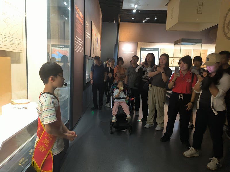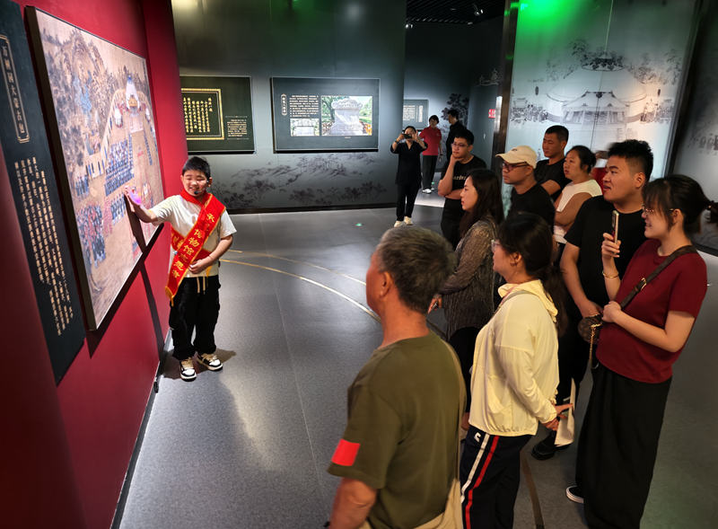 8月21日,河北省承德博物馆“小小讲解员”施坪伯正在向游客讲解文物故事。 新华网发(承德日报社记者 张雨樵 摄)
