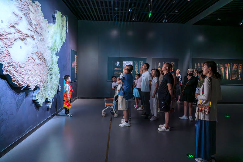 8月21日,河北省承德博物馆“小小讲解员”范腾升正在向游客讲解清朝版图。 新华网记者 钟奕 摄
