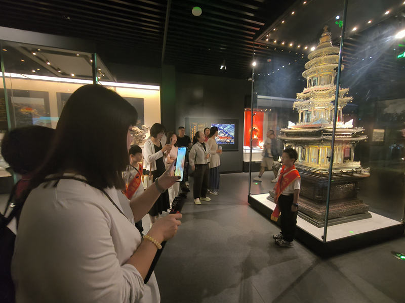 8月21日,河北省承德博物馆“小小讲解员”范腾升正在向游客讲解清代紫檀木座铜胎珐琅塔的故事。新华网发(承德日报社记者 张雨樵 摄)