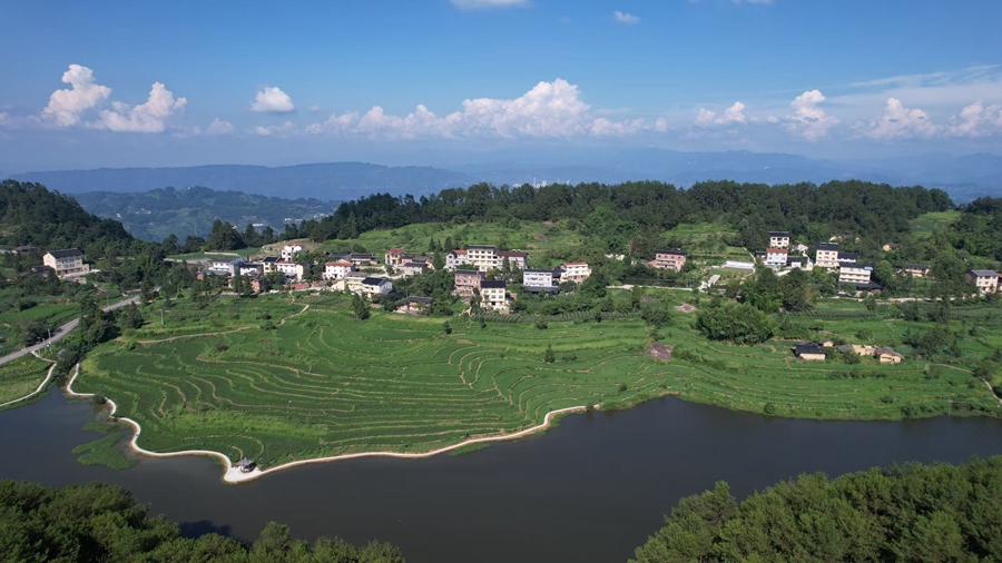 盛夏时节,綦江区郭扶镇同心村,一块块绿意葱茏的稻田沿山地平铺延伸,与近处的水库、远处的林海和村舍组成一幅田园风景画(资料图)。新华网发(重庆市綦江区融媒体中心 黄波 摄)