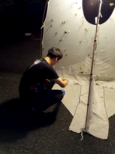 当天色暗下来,山林深处,一盏灯亮起,四周展开白布,不时有飞蛾到来,停留在幕布上。张超蹲在幕布旁,仔细观察着各种飞蛾翅面的斑纹、微微颤动的触角,不时有飞蛾落在他的脸上,还有昆虫爬上裤腿。这是张超进行飞蛾灯诱采集的日常。