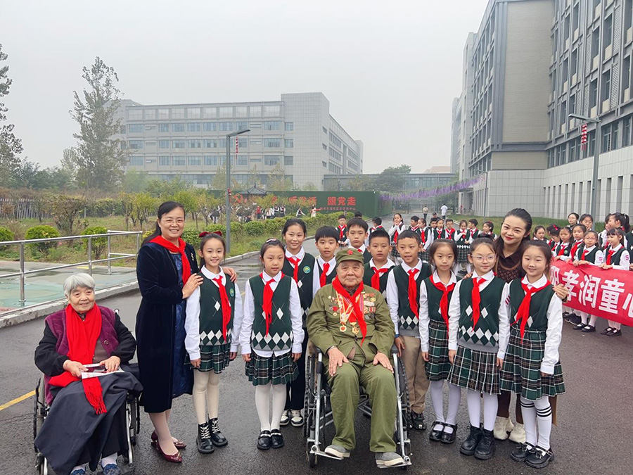 周长芝(左二)和养老院老人与青年路小学师生们的合影。徐州市文明办供图