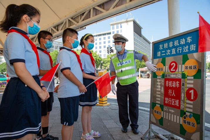 学生们在襄城区檀溪路学习非机动车路口通行规则 。襄阳市文明办供图