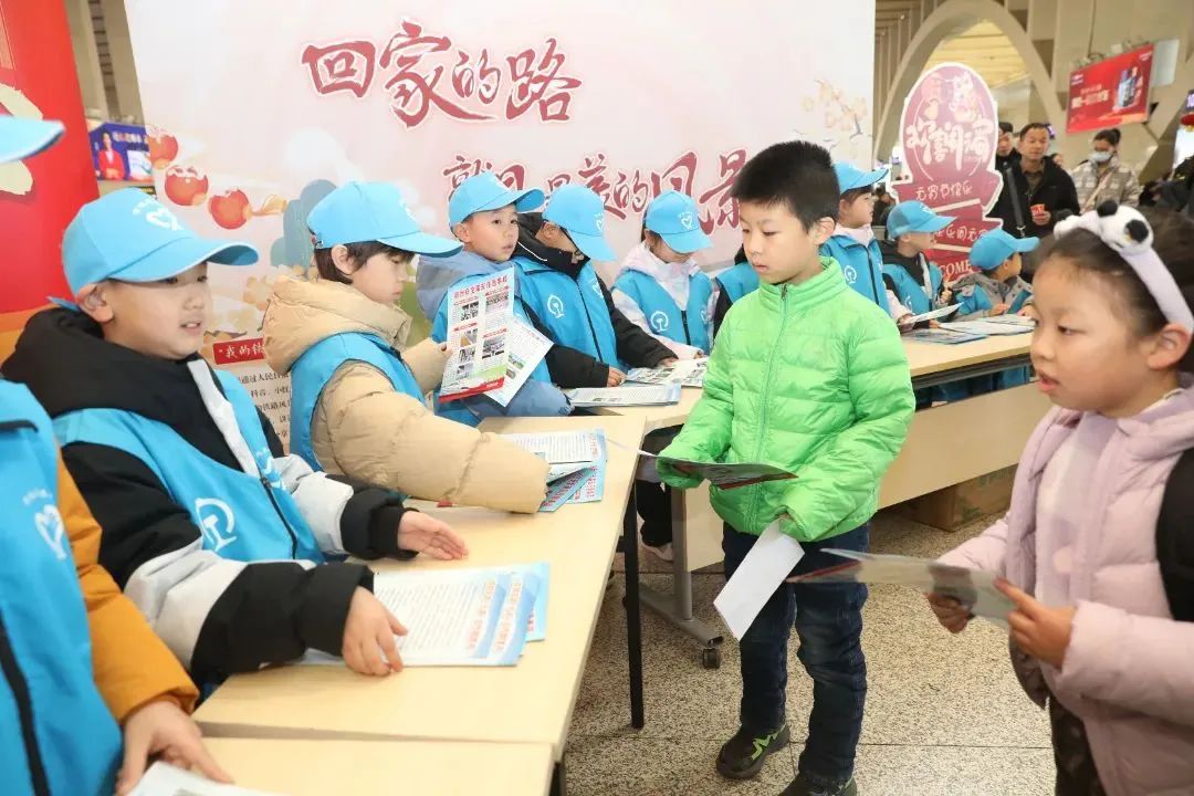 在石家庄站,“小铁路志愿者”给旅客发放爱路护路宣传单。